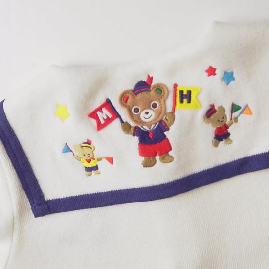 前身頃はワンポイントのワッペンでシンプルなデザインですが、後衿部分には水兵プッチーがデザインされていてミキハウスらしさもばっちり。
